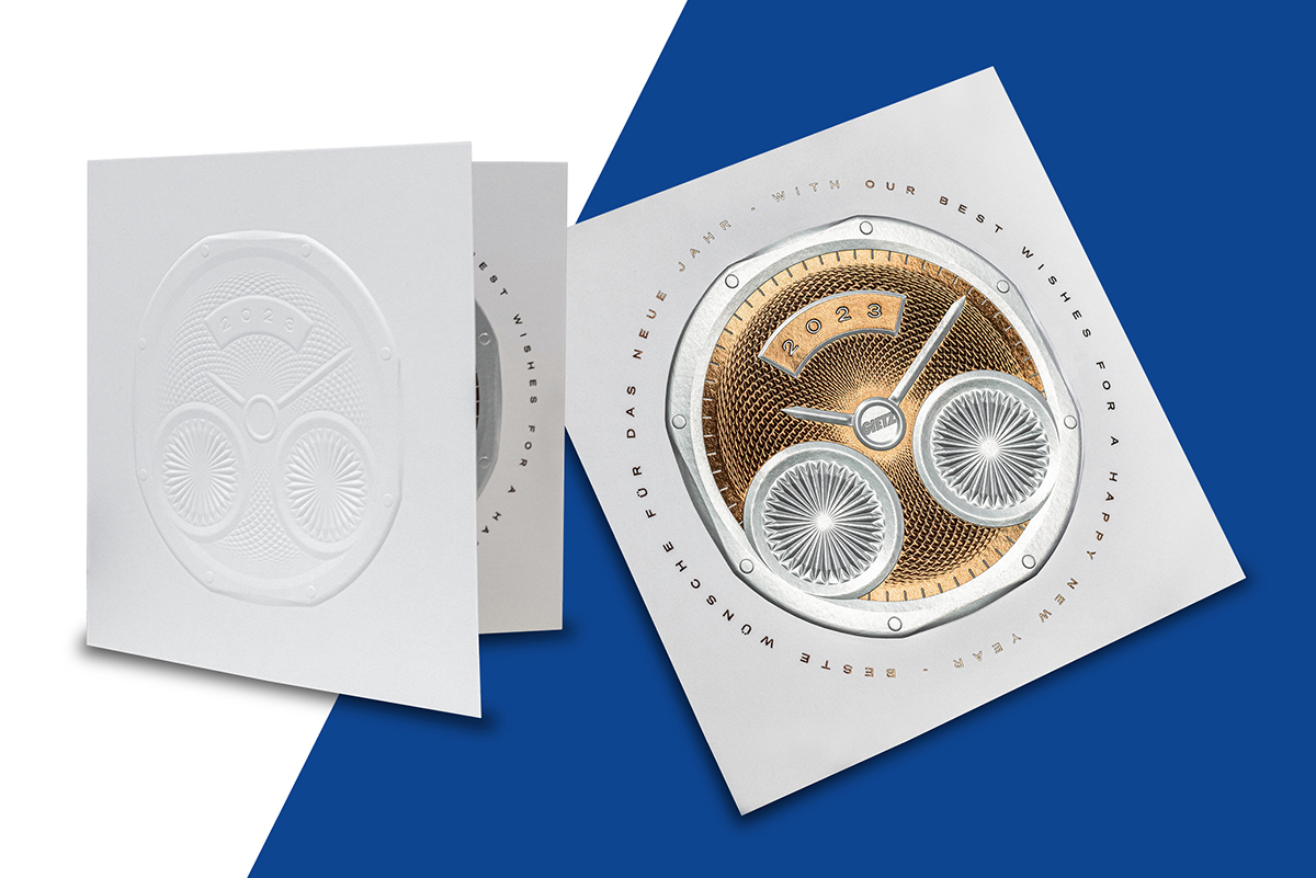 Based on this idea, the company Sonderegger AG from Bronschhofen designed and creates this years card. The cards were of course foil stamped and embossed with a Gietz machine, the FSA 870 Compact.