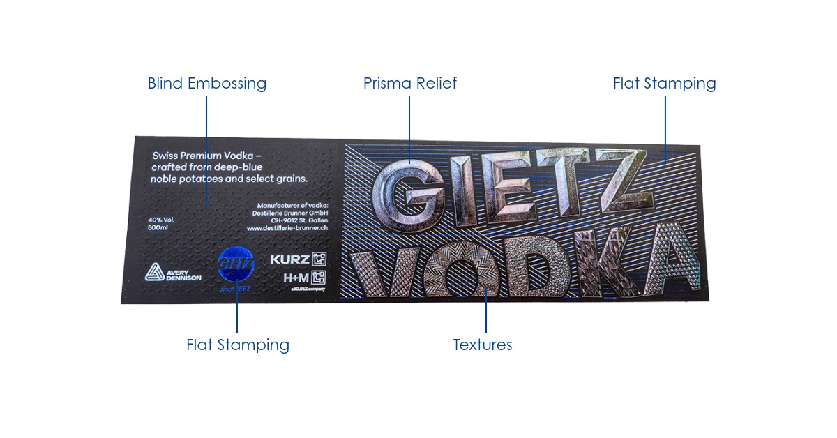 In the third stroke, the lettering “GIETZ” is highlighted with a prismatic relief using a LUMAFIN® Clear 799, while the letters of “VODKA” receive individual texture embossing, using the same product.