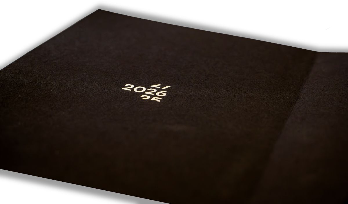 The design and production of our New Year’s card were carried out by Sonderegger AG. The areas of the image were filled with lines at different angles (0°, 45° left, 45° right, 90°) to create a micro-embossing effect. Only one foil color was used, which appears lighter or darker depending on the direction of the lines.