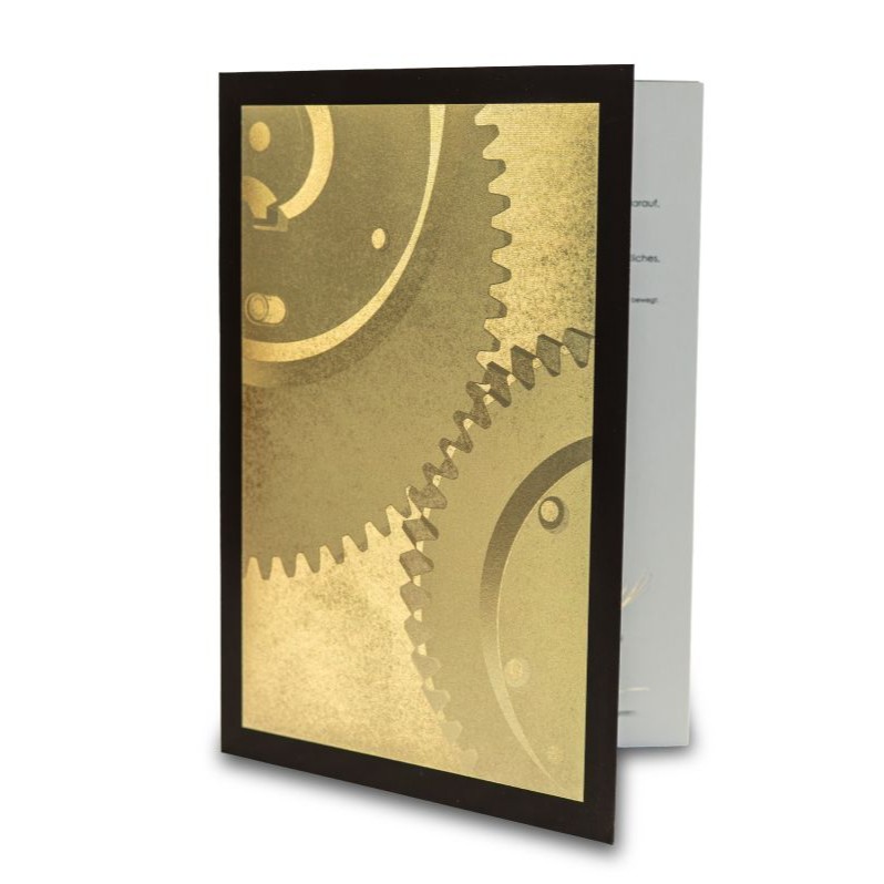 The card was produced using hot-foil embossing on the Gietz FSA 870 Compact and was then die-cut, creased, and folded.